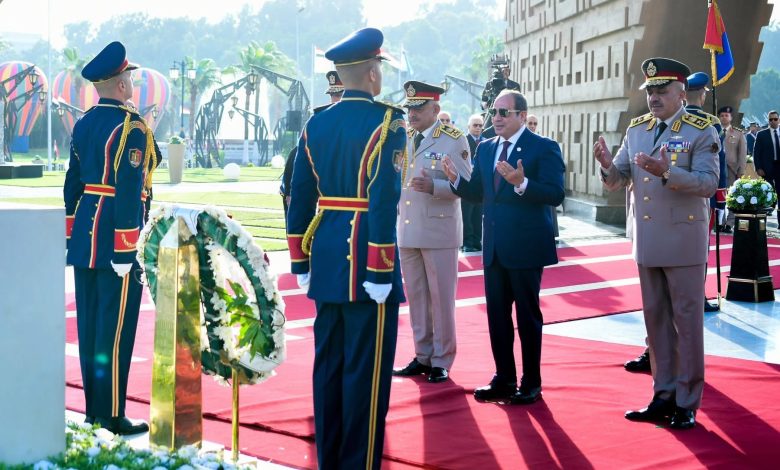 وصرّح المتحدث الرسمي باسم رئاسة الجمهورية بأن الرئيس وضع إكليل الزهور على قبر الجندي المجهول، فيما عزفت الموسيقى العسكرية “سلام الشهيد” تكريمًا لأرواح شهداء مصر الأبرار، وتجسيدًا لمعاني الوفاء والعرفان لتضحياتهم الخالدة. عقب ذلك، قام السيد الرئيس بتحية عدد من قدامى قادة حرب أكتوبر، ثم توجّه سيادته إلى قبر الرئيس الراحل محمد أنور السادات، حيث وضع إكليل الزهور وقرأ الفاتحة على روحه الطاهرة، وقام سيادته عقب ذلك بمصافحة أفراد أسرة الزعيم الراحل وقادة القوات المسلحة. واختُتمت المراسم بعزف السلام الوطني، ثم قام السيد الرئيس بتحية عدد من كبار رجال الدولة قبيل مغادرة سيادته منطقة النصب التذكاري.