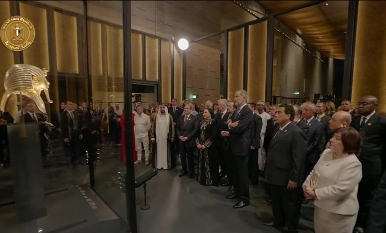 اصطحب الرئيس المصري عبدالفتاح السيسي ضيوف حفل افتتاح المتحف المصري الجديد في جولة داخل المتحف حيث اتجه الزوار إلى قاعة الملك الفرعوني توت عنخ أمون حيث تعرض مجموعته الآثرية الكاملة لأول مرة في مكان واحد وعلى رأسها القناع الذهبي للملك الشاب والتي تعد أغلى قطعة آثرية على وجه الأرض.