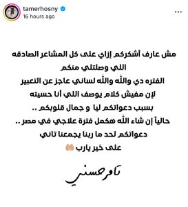 أعلن الفنان تامر حسني من خلال منشور عبر حسابه الشخصي على موقع الصور والفيديوهات “إنستجرام : عودته إلى مصر لاستكمال علاجه بعد إجرائه جراحة استئصال جزء من الكلى؛ حيث كتب: