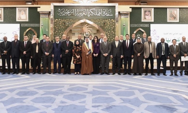 وألقى السفير الحصيني كلمة بهذه المناسبة، أوضح فيها أن المملكة ترجمت اعتزازها باللغة العربية إلى منظومة عمل مؤسسي مستدام، ففي ظل رؤية المملكة 2030، أحدثت القيادة الرشيدة -حفظها الله- نقلة نوعية كبرى بتأسيس مجمع الملك سلمان العالمي للغة العربية، مشيرًا إلى أن المجمع تحوّل إلى مرجعية دولية رائدة لخدمة “لغة الضاد”، طالت أكثر من (60) دولة، إضافة إلى تدشين منصات رقمية تخدم الناطقين بأكثر من عشرين لغة، وتكريم الأفراد والمؤسسات والمبادرات الداعمة للغة العربية وعلومها محليًّا وعالميًّا، لتبقى تلك الجهود شاهدة على أن اللغة العربية، بفضل جهود المملكة المخلصة، تجاوزت مرحلة التدوين والحفظ إلى مرحلة التمكين والتطوير.