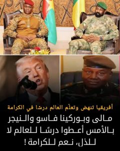 في موقف تاريخي، سجّلت دول مالي و بوركينا فاسو و النيجر مشهدًا نادرًا من الكرامة والسيادة، حين أعلنوا رسميًا منع دخول المواطنين الأمريكيين إلى أراضيهم، طردًا على قرار مماثل من الإدارة الأمريكية* بمنع مواطنيهم من دخول الولايات المتحدة.