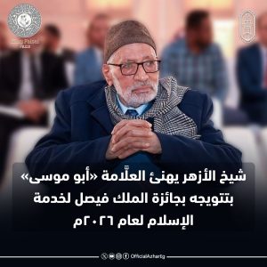 وأكَّد شيخ الأزهر أنَّ تكريم العلامة محمد أبو موسى بهذه الجائزة إنما يعكس المكانة العلميَّة الرفيعة التي يحظى بها فضيلته، ويجسِّد قيمة عطائه العلمي الجاد في خدمة علوم الإسلام، مشيرًا إلى أنَّ فضيلته قدَّم نموذجًا متميزًا في الجمع بين عمق الفهم، ودقَّة المنهج، ورصانة البيان، وأسهم بعلمه وجهده في ربط أجيال من الطلاب بتراثهم العلمي الأصيل، داعيًا الله تعالى أن يبارك في علمه وعطائه، وأن يديم نفعه للأزهر الشَّريف وللأمة الإسلاميَّة.