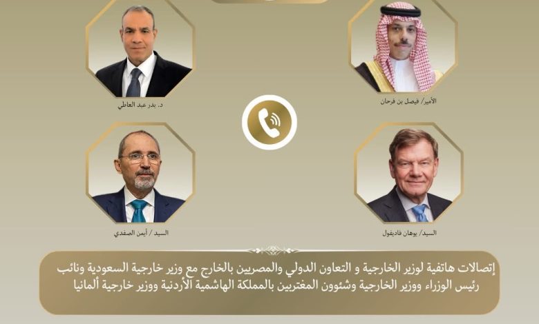 جرت سلسلة اتصالات هاتفية بين د. بدر عبد العاطي وزير الخارجية والتعاون الدولي والمصريين بالخارج، وكل من السيد يوهان فاديفول ووزير خارجية ألمانيا والسيد أيمن الصفدي نائب رئيس الوزراء ووزير الخارجية وشئون المغتربين بالمملكة الأردنية الهاشمية الشقيقة، وصاحب السمو الأمير فيصل بن فرحان وزير خارجية المملكة العربية السعودية الشقيقة، ومسئولين بالمفوضية الأوروبية يوم السبت ٢٨ مارس، حيث تناولت الاتصالات التطورات المتسارعة والتصعيد العسكري الذي تشهده المنطقة، والجهود المبذولة لخفض التصعيد الإقليمي.