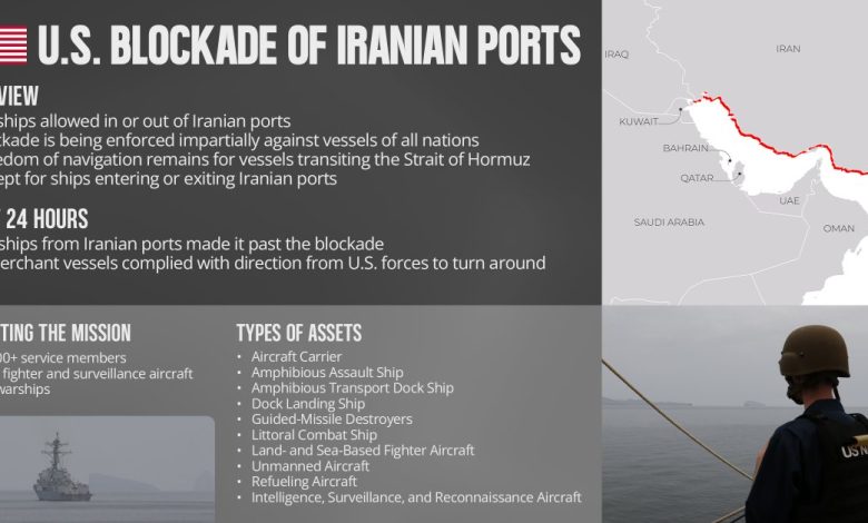 ينفذ أكثر من 10,000 من البحارة ومشاة البحرية وأفراد القوات الجوية الأمريكية، مدعومين بأكثر من اثنتي عشرة سفينة حربية وعشرات الطائرات، مهمة فرض حصار على السفن التي تدخل الموانئ الإيرانية أو تغادرها. وخلال الساعات الأربع والعشرين الأولى، لم تتمكن أي سفينة من اختراق الحصار الأمريكي، فيما امتثلت 6 سفن تجارية لتوجيهات القوات الأمريكية بالعودة أدراجها والدخول مجدداً إلى أحد الموانئ الإيرانية الواقعة على خليج عُمان.